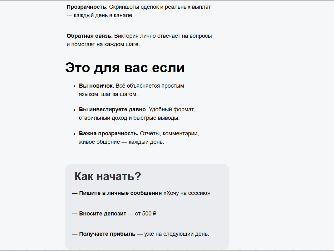Прибыль будет выплачена уже на следующий день, однако примерный размер дохода не обозначен. Такой быстрый срок уже вызывает опасения. Девушка пишет, что сотрудничество подойдет новичкам, а также профессионалам в трейдинге и инвестировании. Для того чтобы начать работу, нужно обратиться к админу в личные сообщения.