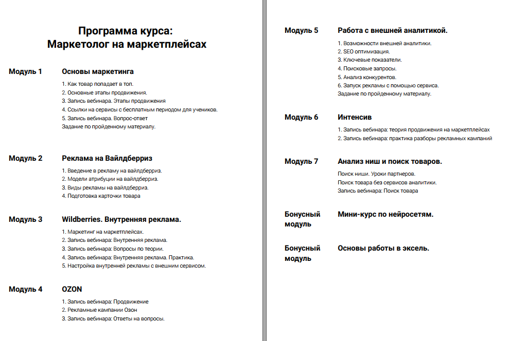 Курс «Менеджер по рекламе на маркетплейсах» состоит из 30 вебинаров и его стоимость составляет ₽27,490. На нем изучаются основы маркетинга и особенности настройки рекламы на маркетплейсах, а также есть модуль о поиске товара и ниши.