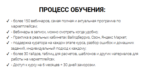 Курс «Менеджер маркетплейсов: все включено» стоит ₽39,490 и включает в себя более 150 вебинаров. Полученные на нем навыки можно отработать в настоящих кабинетах на WB и Ozon.
