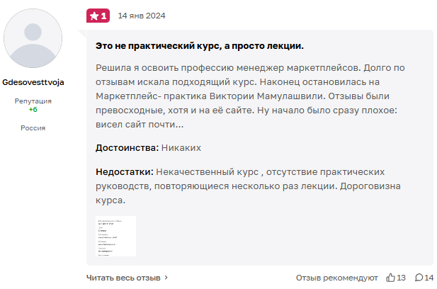 Однако на сторонних сайтах об обучении у Мамулашвили высказывают противоположное мнение. Пользователи жалуются на то, что никакой обещанной практики на курсах нет, а некоторые лекции повторяются несколько раз.