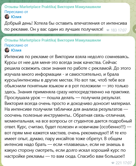 Для отзывов Виктория Мамулашвили создала отдельный телеграмм-канал с ником @MPraktika_otzyv. Они публикуются как сообщения от довольных учеников, которые благодарят наставника за ее курсы и интенсивы.