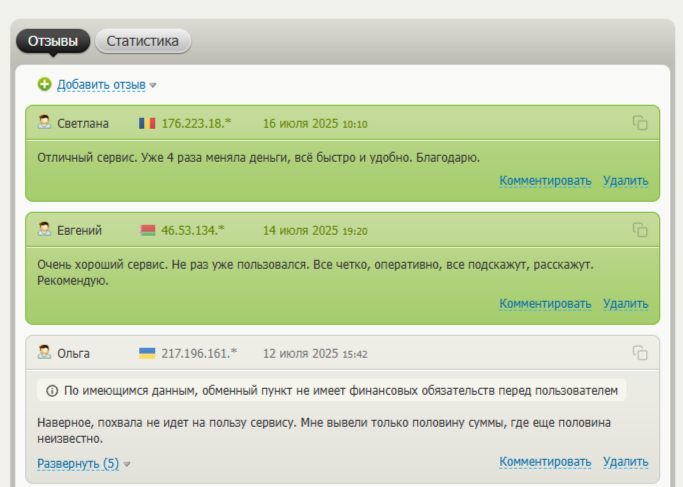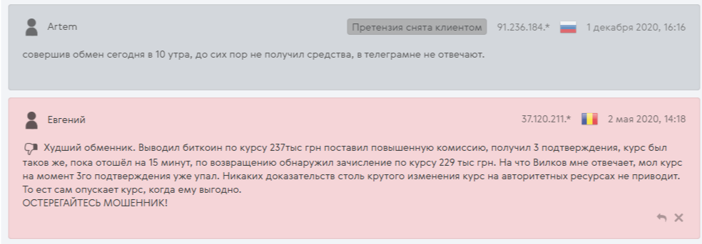 Во время проверки интернета нашей командой были обнаружены как позитивные, так и негативные отзывы об обменном пункте на портале мониторинга-партнера. В них сервис благодарят за быстроту и удобство, а также обвиняют в присвоении клиентских средств.