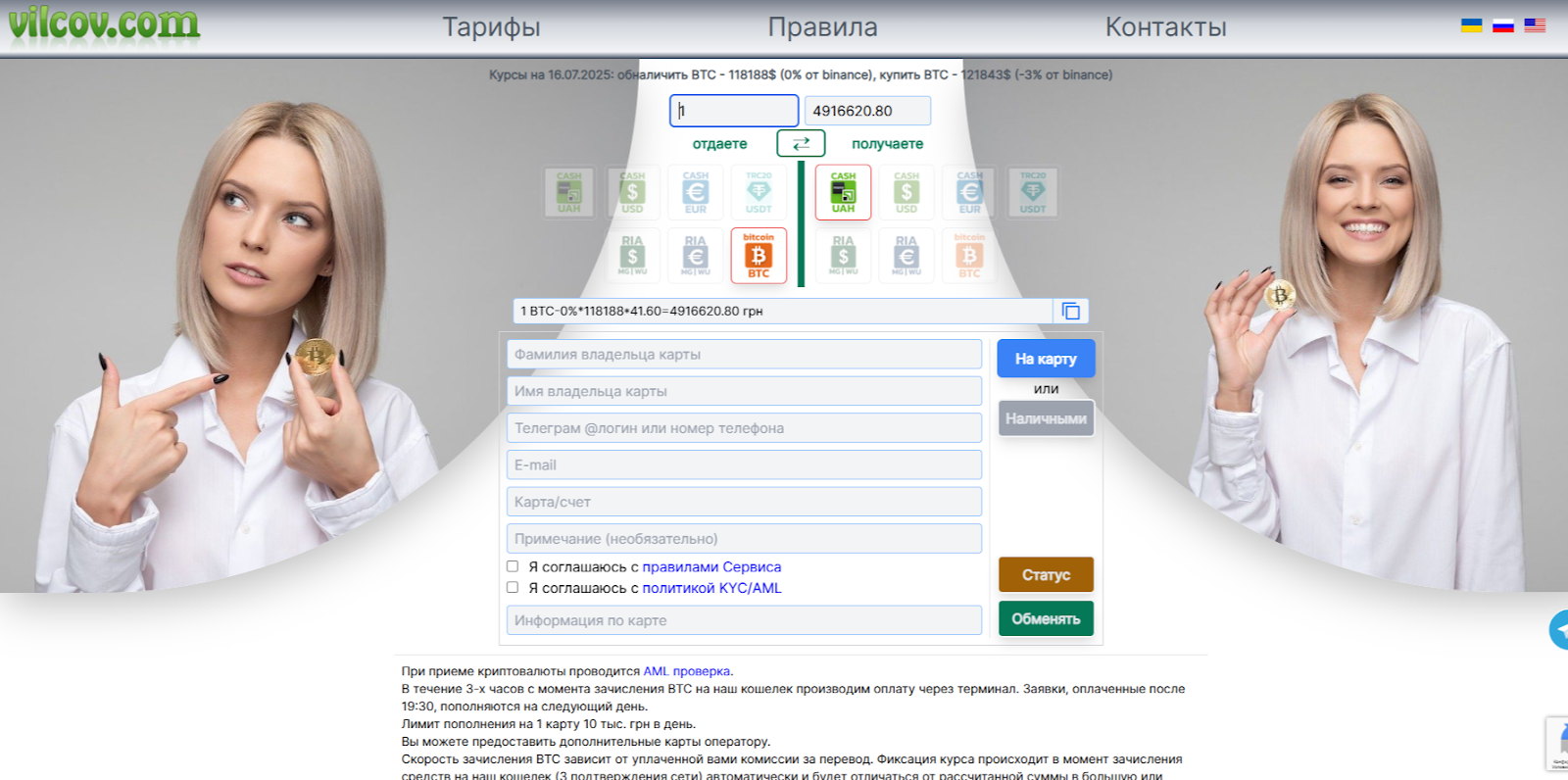 Криптовалютный обменник занимается транзакциями с TRC20 и BTC. На момент обзора к обмену недоступны иные цифровые активы. Обменять криптовалюту можно на евро, доллары или гривны. При приеме электронных монет проводится AML проверка. Лимит пополнения на одну карту банка составляет 1 000 грн. Для обмена в Vilcov большей суммы можно предоставить оператору несколько карт.