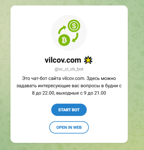 Криптовалютный обменник доступен пользователям в будние дни с 08:00 до 22:00. В выходные сервис работает с 09:00 до 21:00. При появлении проблем с обменом клиенты сервиса «Вилков» могут обратиться в службу поддержки, которая отвечает на вопросы в телеграм-канале vc cl ch bot.