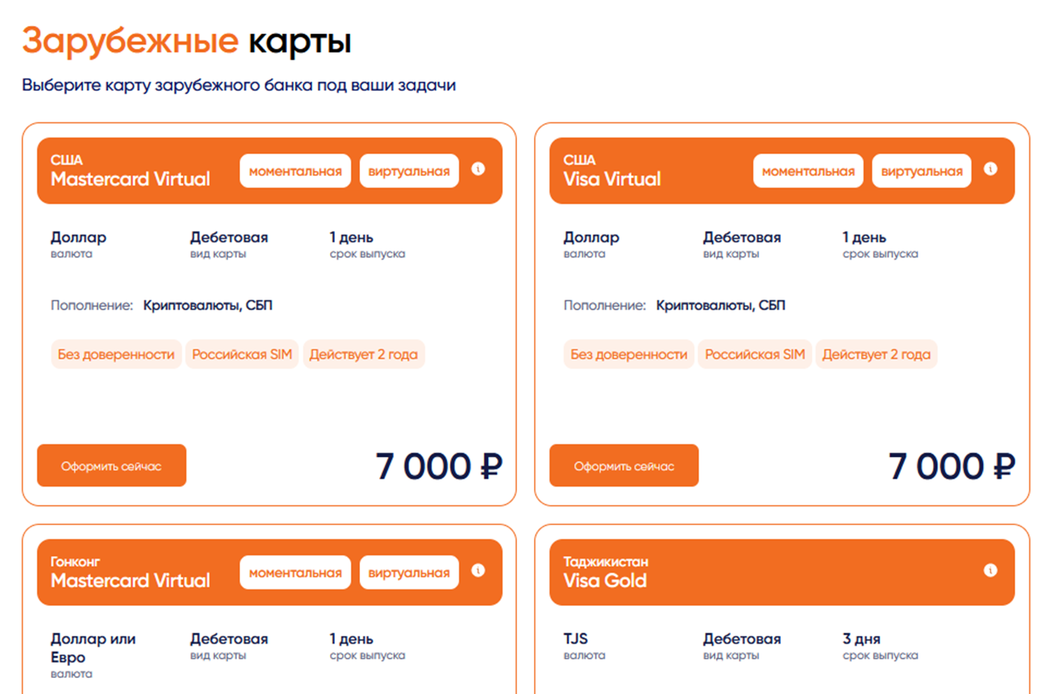 На сайте ВизаТут предлагается широкий выбор платежных средств разного типа. Стоимость открытия зависит от карты, системы, необходимости получения физического пластика. Есть виртуальные платежные средства со счетом, открываемым в американских долларах. Для пополнения подходят система СБП или крипта. Срок действия пластика – 2 года, стоимость оформления – от 7000 рублей.