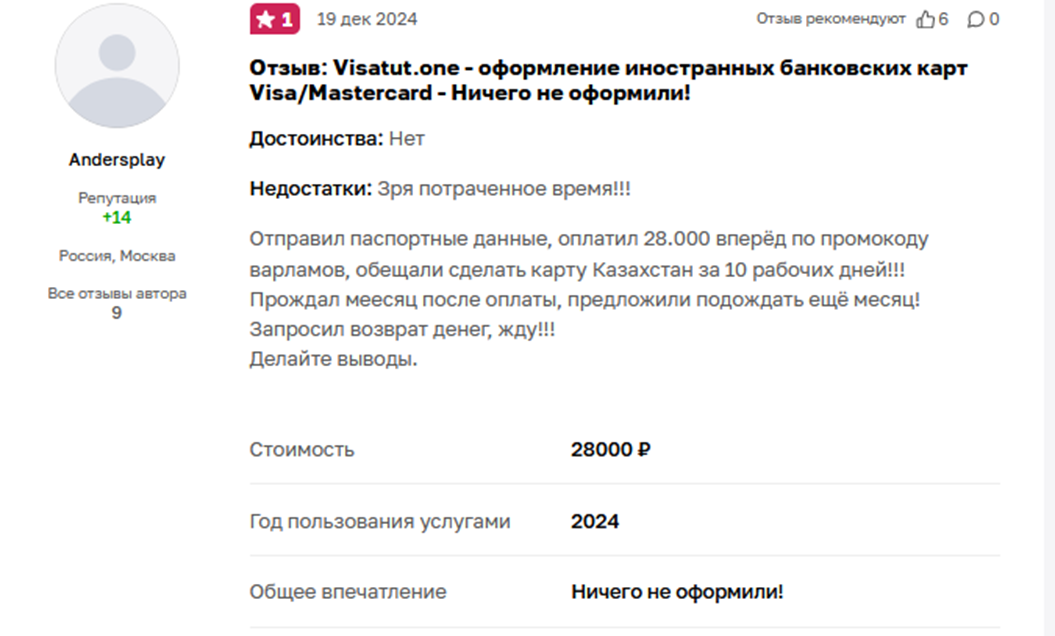 Но не все клиенты довольны, есть отрицательные отзывы, где компанию ВизаТут обвиняют в мошенничестве. Один из пользователей оставил жалобу на то, что карту он не получил. Платеж в размере 28 тысяч и личные паспортные данные были отправлены. Оператор предложил карту банка Казахстана, обещал все сделать за 10 дней. Однако услуга не была оказана. Через месяц ожидания оператор предложил продление срока еще на 30 дней. Клиент отказался, запросил возврат средств. Комментариев представителей платформы о сложившейся ситуации нет. Также неизвестно, получил ли клиент свои деньги назад.