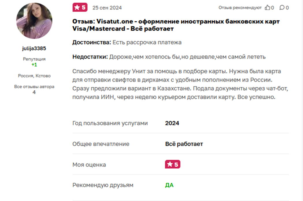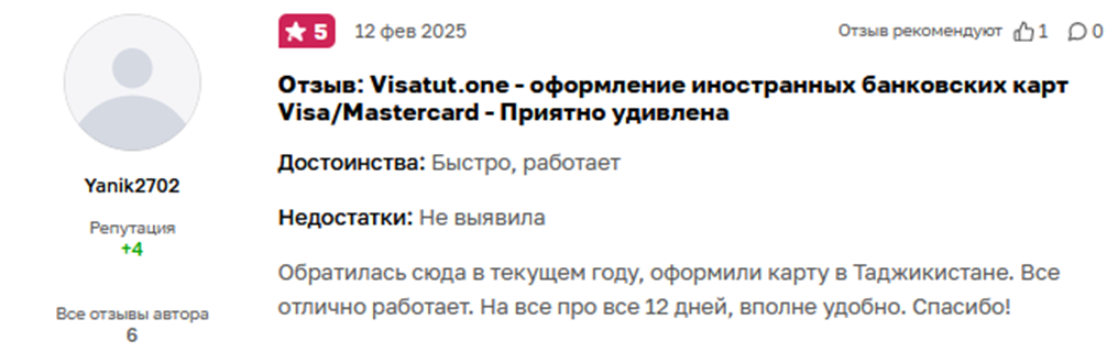 Компания ВизаТут Ван предоставляет услуги по онлайн получению карт уже более 2-х лет. Количество жалоб минимальное, но они есть, что говорит о рисках сотрудничества с сервисом. Поэтому однозначно рекомендовать платформу, как надежный инструмент оформления зарубежной карты, сложно.