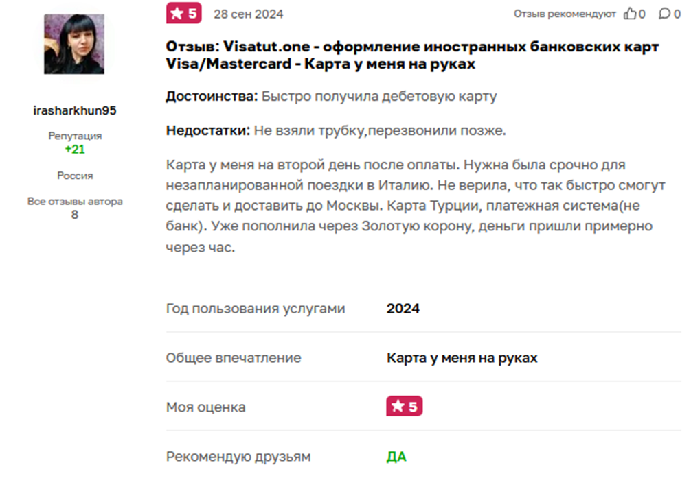 Найденные отзывы о компании Visatut One неоднозначные. Большая часть рецензий положительная, клиенты говорят о возможности быстрого оформления карт. Обычно на доставку требуется около 12 дней, ехать никуда не нужно, все оформляется удаленно.