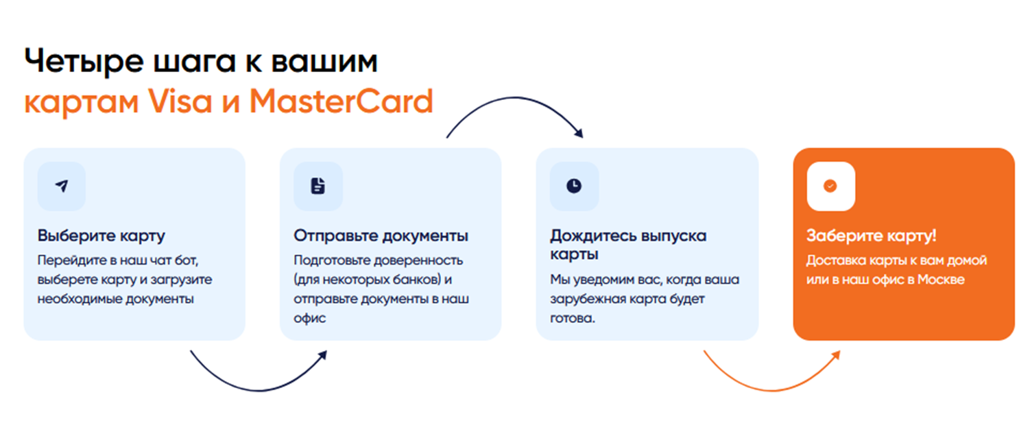 Чтобы оформить банковскую карту онлайн, надо выбрать вариант и загрузить документы через чат-бот на сайте. Для некоторых банков дополнительно нужна доверенность. То есть предварительно следует подготовить все бумаги, оформить их у нотариуса. С оператором Виза Тут надо согласовать условия оплаты и сроки получения карты. Когда она будет готова, клиент получает уведомление. Доставка готового платежного средства возможна по адресу заказчика или в офис ВизаТут в Москве.