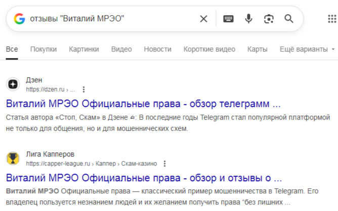 Чтобы узнать подробности о его деятельности, мы обратились поисковику. Здесь его имя упоминается всего лишь в двух статьях, причем обе они с разоблачением. Мы изучили данные источники и увидели, что Виталий работал через телеграм-канал «Виталий МРЭО Официальные права», но нам не удалось найти ссылку на этот блог.