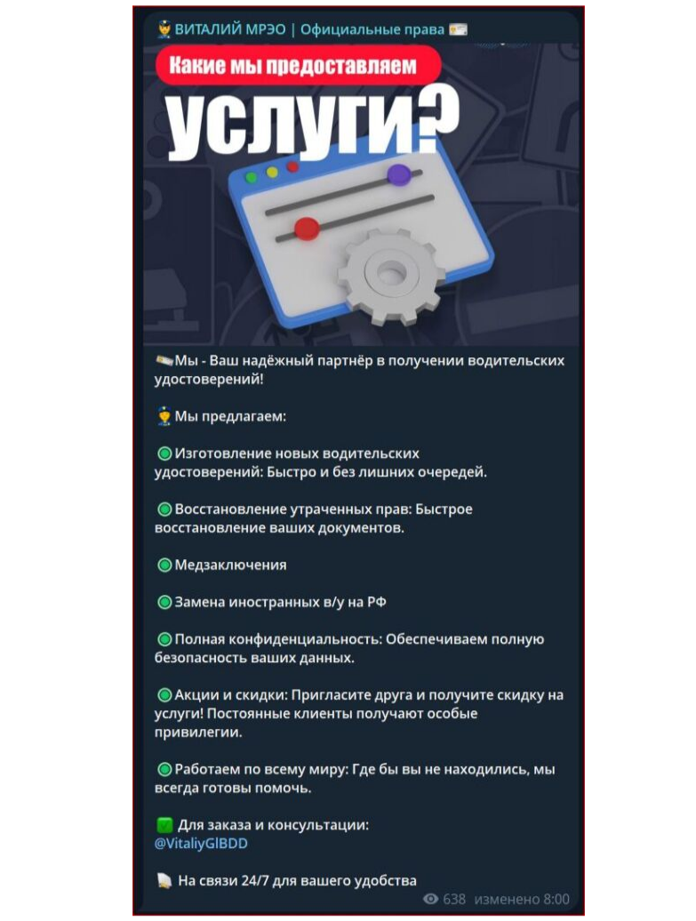 Также в вводном сообщении автор пишет, что он помогает оформить все имеющиеся категории прав. Плюс, клиенты здесь могут восстановить свои документы после лишения, а также заменить иностранные на российские.По словам руководства, от пользователей практически ничего не требуется: не нужно оформляться в автошколе, сдавать экзамены, проходить все комиссии и так далее. Причем и оплачивать документы нужно только после их изготовления. Якобы данный момент подтверждает легальность деятельности блогера.