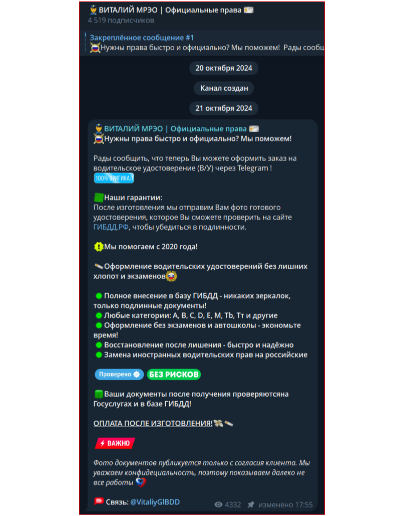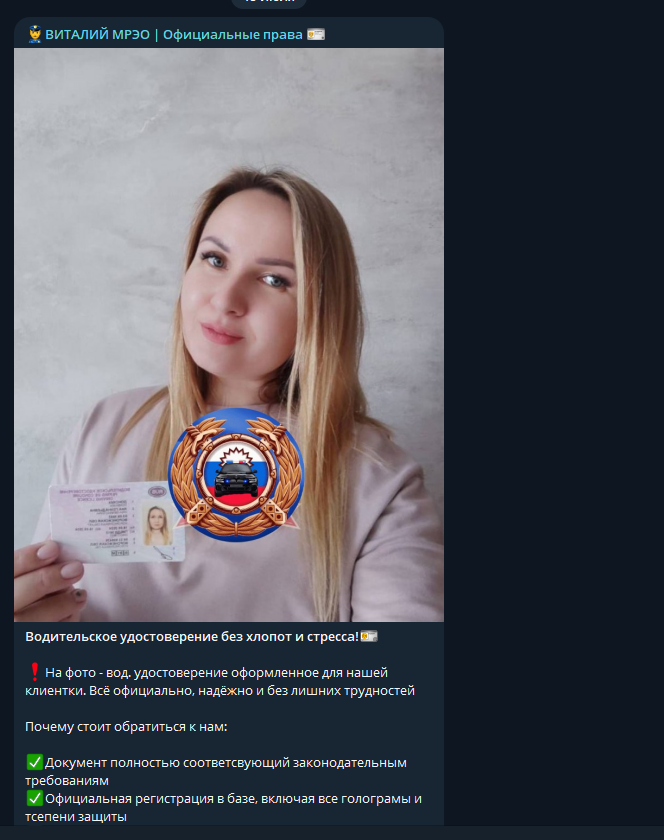 В первом сообщении на канале Виталий @ VitaliyGlBDD написал, что он помогает оформить заказ на права прямо через мессенджер Телеграм. Он гарантирует, что подлинность документа можно будет проверить через официальный сайт ГИБДД РФ.