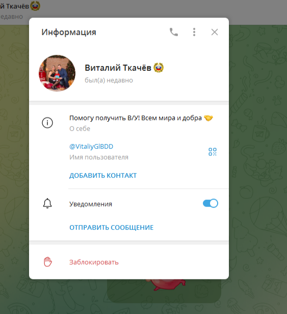 В последнее время участилась новая схема мошенничества, в рамках которой людям предлагают получать без экзаменов и прочего труда водительские права. Так, сегодня к нам на проверку попал персонаж Виталий Ткачёв @ VitaliyGlBDD. Все, что нам доступно, это его страница в телеграм.
