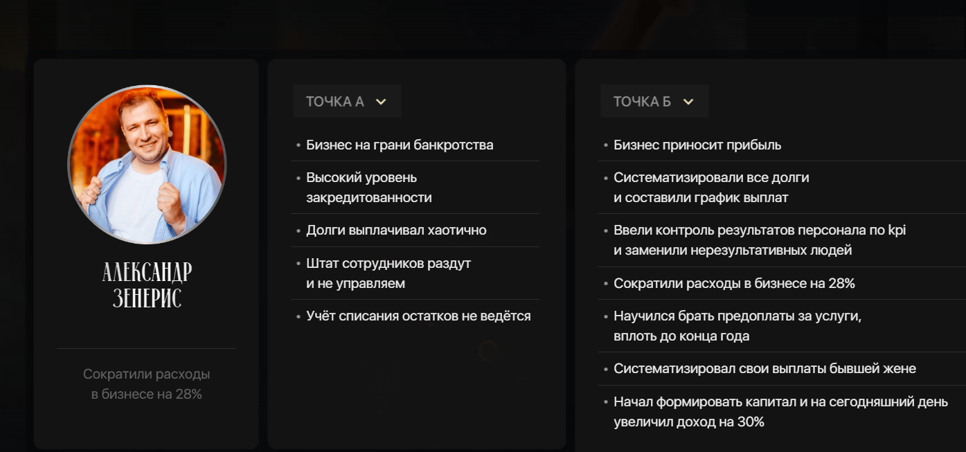 На сайте инвестора можно найти разборы успешных кейсов, где аналитик показывает результаты резидентов своего клуба. Если верить ему наслово, партнеры проекта решают свои проблемы и добиваются больших успехов.