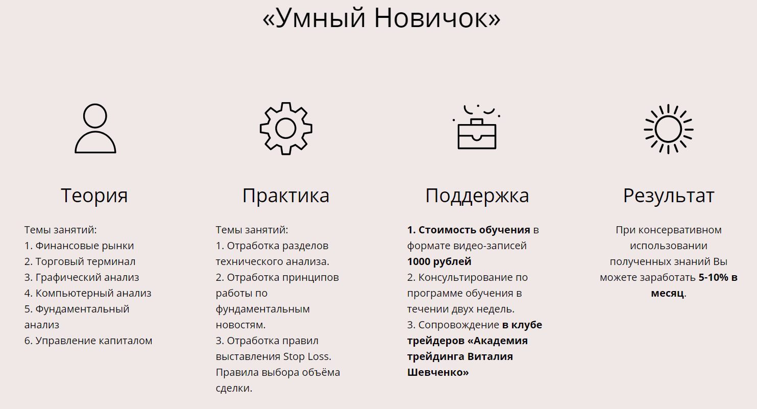 Данные нюансы подвергают сомнению прозрачность данного проекта. Мы не рекомендуем покупать курсы трейдера Виталия Шевченко. Если Вы уже сотрудничали и воспользовались обучающими материалами эксперта, оставьте ваш комментарий.