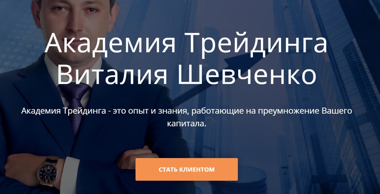 Биржевой трейдер Виталий Шевченко заявляет, что он является автором курсов на тему биржевой торговли и создателем автоматизированных торговых систем. Он начал трейдинг на фондовых рынках с 2005 г., Виталий вначале только терял денежные средства. С 2008 г. стал заниматься этой деятельностью профессионально, работал во многих брокерских компаниях. В 2014-м году совместно с партнерами стал создателем учебно-аналитического центра «Академия трейдинга» и собственного проекта Shevchenko Club, которые не привязаны к определенному брокеру. Доверять ли ему, решать вам, итоги анализа деятельности и выводы будут внизу статьи.
