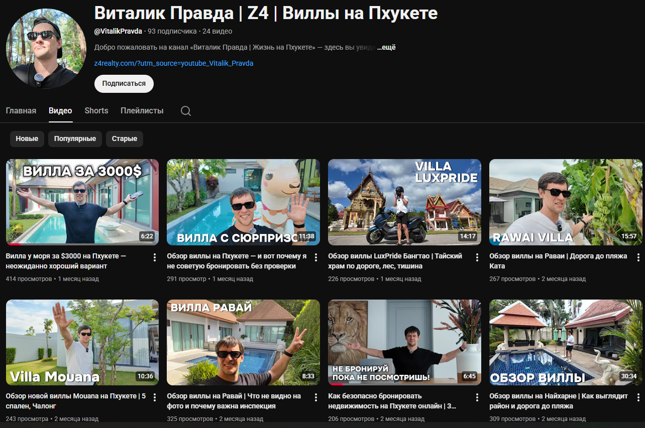 Канал агента по недвижимости Виталия начал работу в октябре 2023 года. Его владелец живет в Таиланде, работает с местной недвижимостью и создал сайт на эту тему. Он якобы подбирает самые интересные варианты для краткосрочной аренды и предлагает их российским туристам.