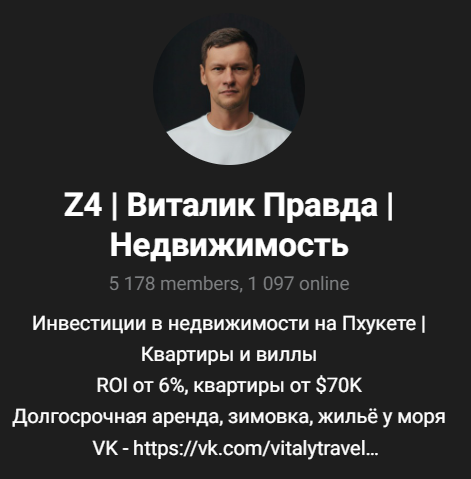Телеграмм-канал Виталий z4 Недвижимость Пхукет отзывы от подписчиков пока не получил. Он работает в тематике недвижимости, предлагает арендовать через него апартаменты или виллы в Таиланде. Рассмотрим, как работает Виталий z4 и можно ли ему доверять.