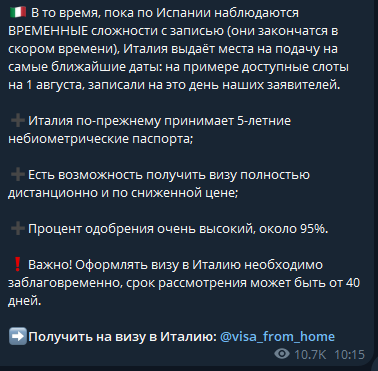 Viza iz doma обещает помочь с получением шенгенской визы, делая акцент на Франции и Италии. Главный козырь – быстрая запись на подачу документов. Менеджеры уверяют, что находят свободные слоты, недоступные в общей очереди.Для клиентов, которые уже сдавали отпечатки пальцев, предлагается полностью дистанционная услуга «под ключ». Это значит, что от клиента требуется только прислать документы курьером. Авторы канала заявляют о невероятно высоком проценте одобрения – около 95%.