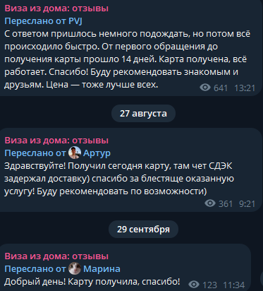 Найти независимые отзывы о «Виза из дома» на сторонних сайтах или форумах нам не удалось. Проект как будто существует в вакууме. Единственное место, где можно увидеть мнения клиентов – это второй телеграм-канал otzyvy vfh.
