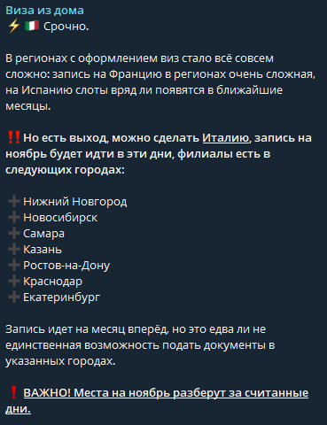 Лента канала «Виза из дома» выглядит очень профессионально и убедительно. Здесь постоянно публикуются свежие новости из мира виз: изменения в работе консульств, появление новых слотов для записи, предупреждения о мошенниках. Авторы делятся инсайдами, например, о сложностях с получением испанской визы или о внезапной щедрости итальянцев.