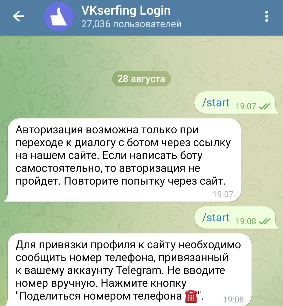 Для заработка на бирже нужно иметь аккаунты в социальных сетях. Задания даются для Телеграмм, Фейсбук, Твиттер и т.п. Предварительно нужно зарегистрироваться. Сделать это можно на официальном сайте. Также можно авторизоваться через аккаунт в мессенджере с помощью телеграмм-бота VKserfing Login. После его активации следует нажать на “Поделиться номером телефона”.
