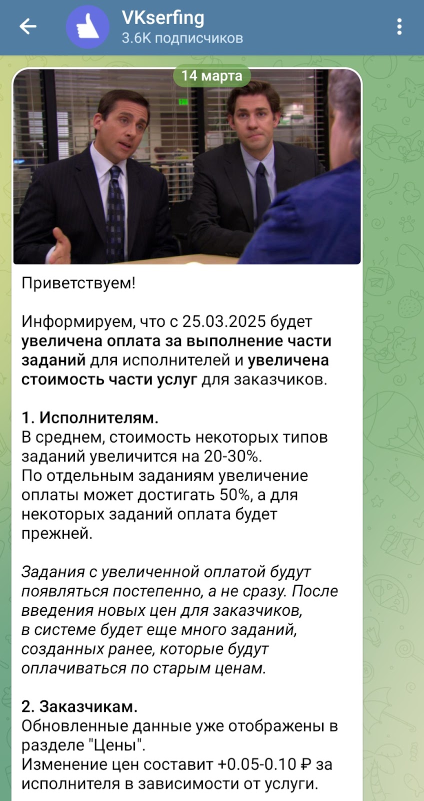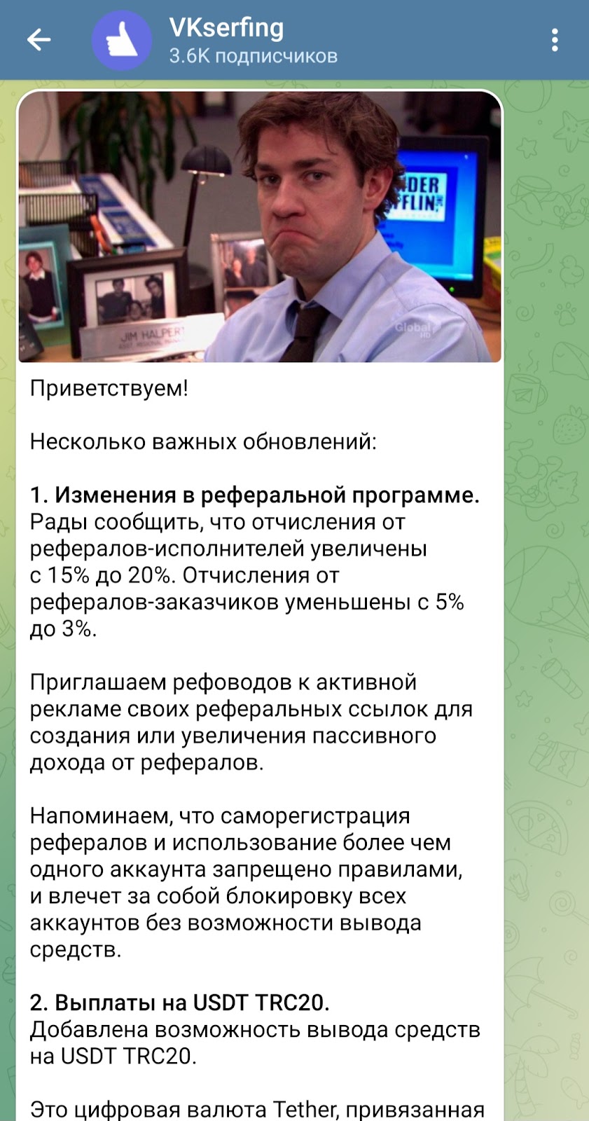У биржи есть группа в телеграмм Vkserfing channel. У нее 3,6К подписчиков. Ведется она с 18 мая 2023 года. Тут публикуются новости о бирже для реселлеров и фрилансеров. Их просматривает и комментирует около 13% аудитории. Сообщество ведется неактивно: последний пост был выложен 3 июля 2025 года.