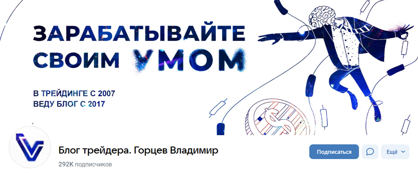 - Блог трейдера. Горцев Владимир в ВК. Эта группа одна из наиболее популярных в социальных сетях, ведь здесь удалось собрать аудиторию в 292 тыс. человек. Тематика публикаций — трейдинг и вопросы инвестирования.