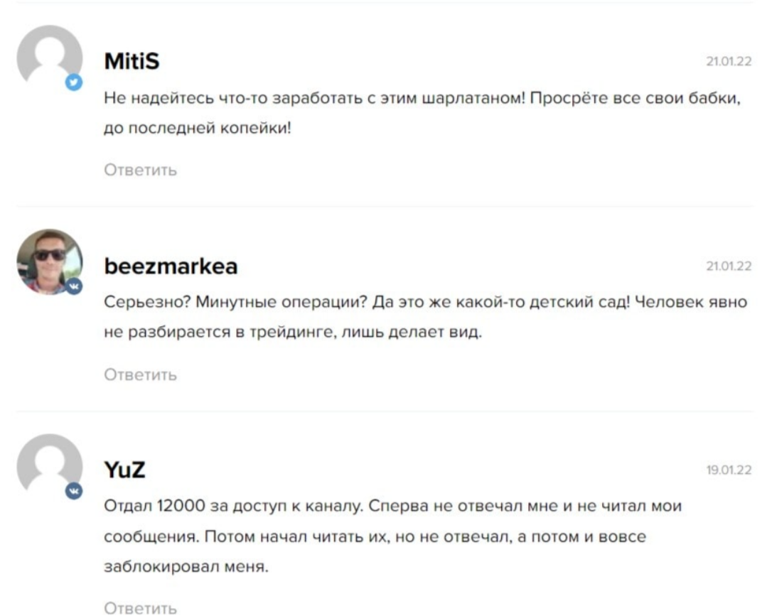 Если глянуть на отзывы, которые находятся на сторонних проектах, они в корне отличаются. В них часто встречаются жалобы на мошенника, а именно качество его обучения и бесполезность торговых сигналов. Как правило, клиенты отмечают, что не получили результата от сотрудничества идаже потеряли деньги.