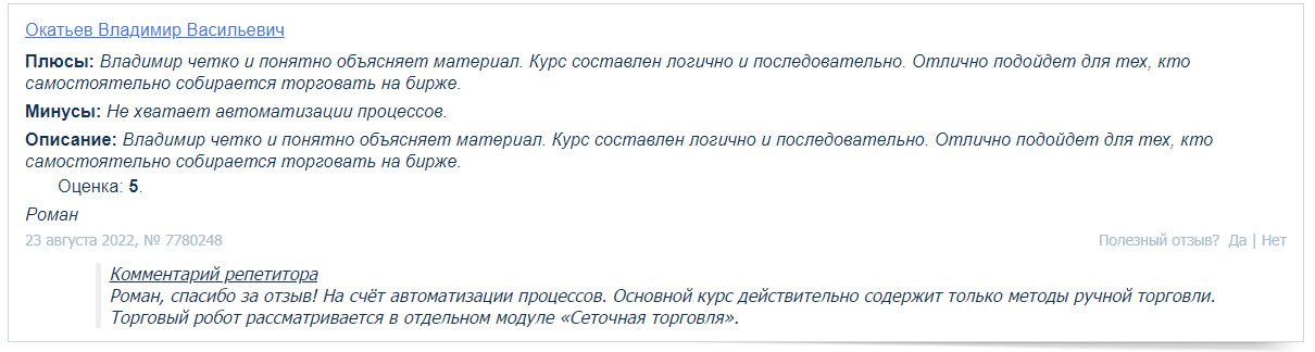 Отзывы о Красоте биржевой торговли можно найти на тех же сайтах, где и рекламу услуг репетитора Окатьева. В них только положительные комментарии, но они не содержат реальной статистики торговли до и после прохождения обучения. Хотя данные платформы обещают следить, чтобы пользователи оставляли отзывы только после реально оказанной услуги, но проверить торговли ученика таким ресурсам не приходило в голову.