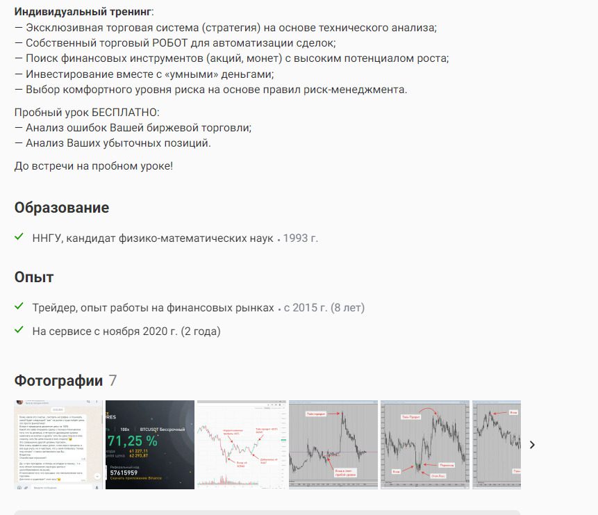 О трейдере мало информации в сети. На Профи.ру есть описание его карьеры, а также расписаны услуги, которые Владимир предоставляет на платформе. У автора есть Телеграмм канал с небольшим количеством участников. Под постами иногда встречаются комментарии, но их очень мало. Сами публикации выходят редко, последняя датируется мартом 2023 года. Функционирует ресурс около полугода.