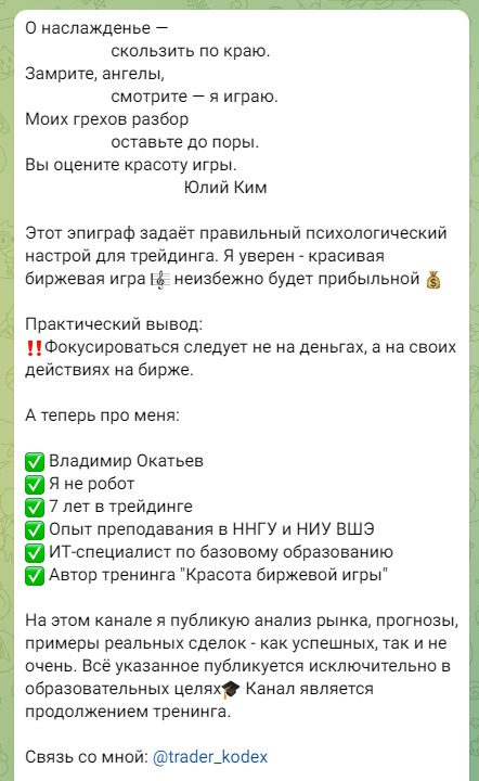 Сигналов автор не дает, платного закрытого клуба нет, сторонние ресурсы не рекламирует. Выкладывает свое видение рынка, как криптовалютного, так и фондового. Изредка делится с аудиторией результатами сделок своих выпускников. Информацию о стоимости, длительности и программе курса в канале не найти. Подробности есть на Профи.ру. Там же опубликованы отзывы о наставнике. Длительность и цену предложено обсуждать в индивидуальном порядке в зависимости от опыта и знаний ученика. Для пользователей предложен бесплатный пробный урок, на котором Владимир проанализирует торговлю и обозначит ошибки ученика.Окатьев обучает индивидуально, но каждому гарантирует следующее: