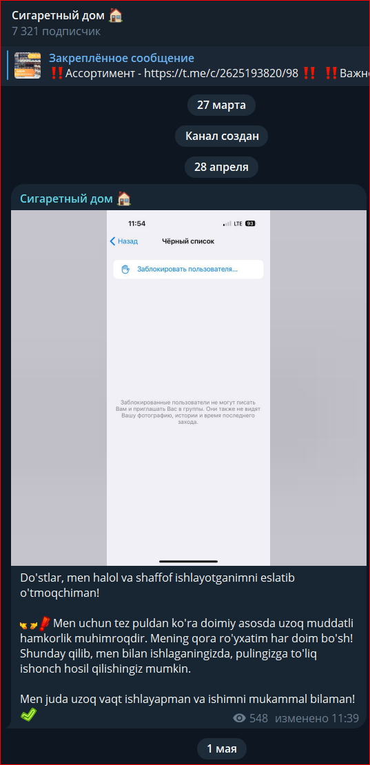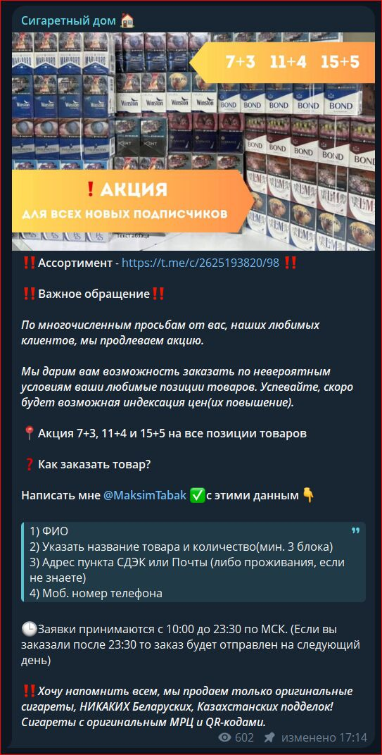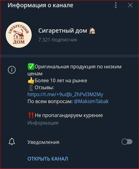 Ранее действительно был паблик с табаком, но поисковый робот посчитал его мошенническим и удалил. Несмотря на это, наша редакция смогла найти недостающие данные. Скриншот, который прикреплен выше, мы нашли на внешних ресурсах. Как видно по нему, владелец ТГ канала «Сигаретный дом» пытается прогреть пользователей утверждениями об оригинальной продукции и опыте более 10 лет.