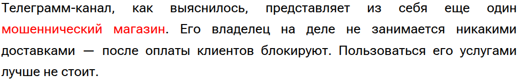 На самом телеграме есть только положительные отзывы о том, что товар качественный и доставка прошла быстро. Верить не стоит, так как подтверждения реальности фидбеков отсутствуют.