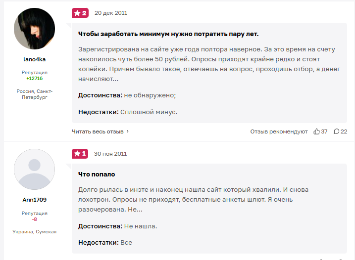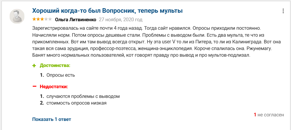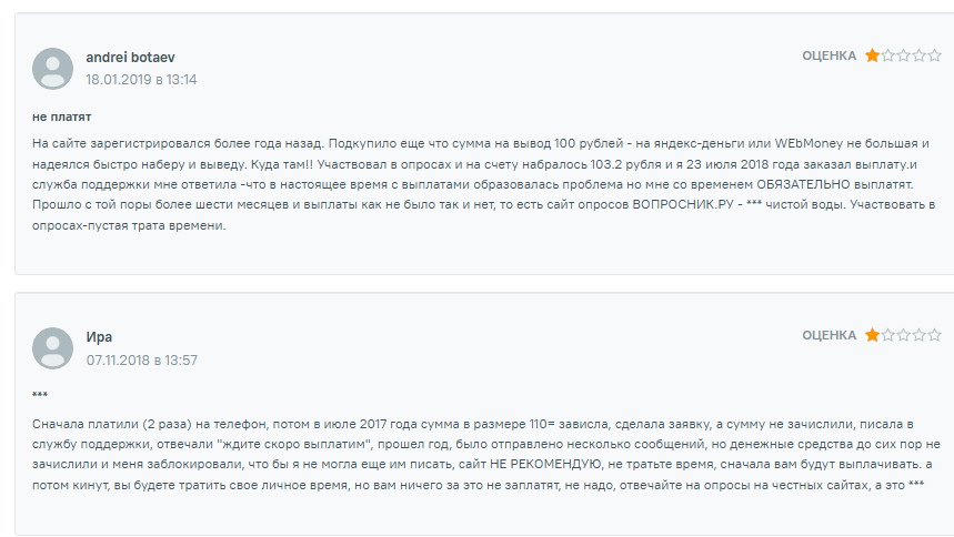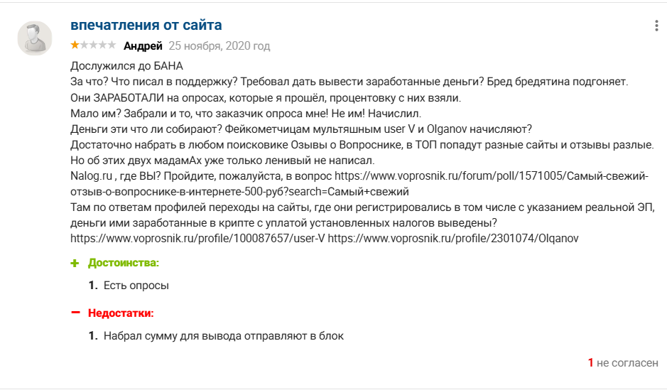 В интернете есть как негативные, так и положительные отзывы о Voprosnik ru, однако жалоб на сервис все же больше. Пользователи отмечают, что получить участие в опросе крайне сложно, а заработать на нем — задача почти нерешаемая. Количество участников в каждом задании ограничено, попасть в их число могут только самые быстрые. При этом сумму дохода часто режут, мотивируя снижение платы тем, что участник либо неправильно заполнил форму, либо подошел в фокус группу не по всем параметрам. Но главная проблема платформы — вывод средств. Проект заблокировал массу аккаунтов без объяснения причин сразу, как только они собрали деньги на первую заявку на снятие.