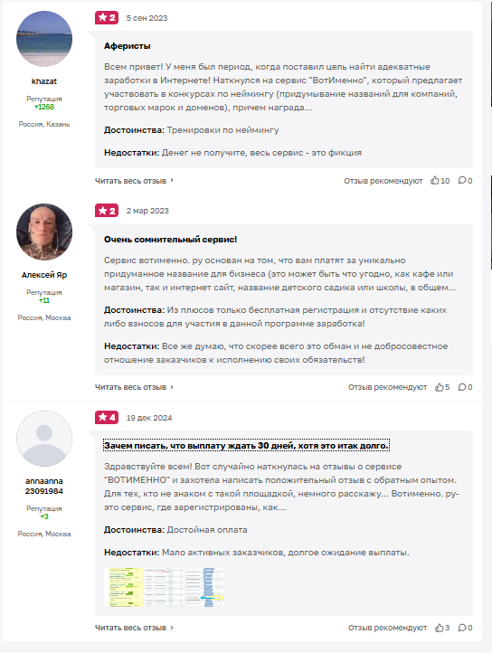 О сервисе «Вот именно ру» отзывы в сети в большинстве негативные. Редко встречаются комментарии с положительным опытом сотрудничества. Большая же часть пользователей сообщают, что потратили кучу времени, придумывая названия, но так ничего и не заработали. Те, кому удалось все же заработать на своих названиях, не смогли вывести деньги. Оказывается, что на платформе обозначено, что вывод средств осуществляется от 30 дней. Это очень большой срок. На биржах фриланса обычно вывод денег занимает не более 5 рабочих дней. Но даже 30 дней оказались не пределом, мы нашли комментарии пользователей, которые ждут оплату уже более 5 месяцев. Вероятно, трудности с выплатами и стали причиной закрытия сайта.