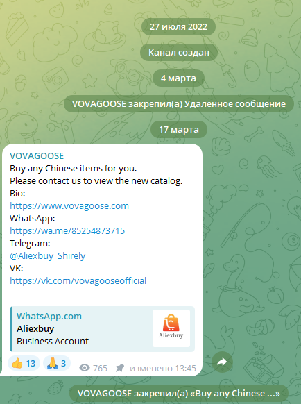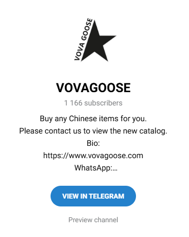 Vovagoose – это канал в Telegram, который предлагает пользователям помощь в покупке товаров из Китая. Основная активность ведется через социальные сети и мессенджеры. Потенциальным клиентам предлагают заказать одежду и другие категории продукции. При этом основной способ связи с представителями проекта – Telegram и WhatsApp.