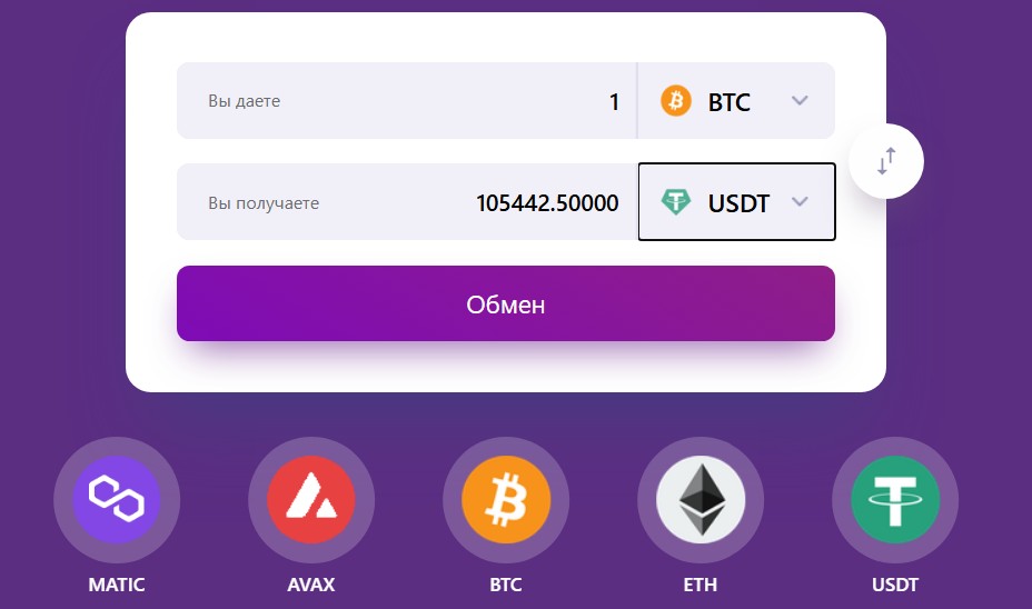 Клиентам обещают удобный обмен криптовалют, но подробной инструкции нет. Сам процесс включает выбор направления, перевод средств и получение валюты на кошелек. Среди активов доступны Bitcoin, Ethereum и другие монеты.