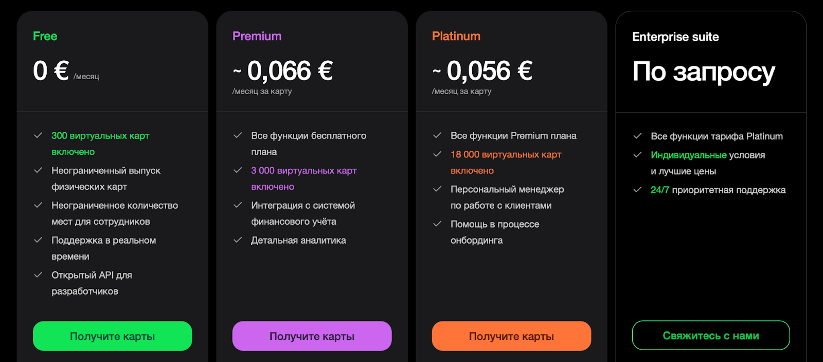 - бесплатный. Включает в себя возможность открытия 300 виртуальных карт, число мест для сотрудников не ограничено, количество физических карт тоже. Есть открытый API для разработчиков и более комфортного управления. Действует постоянная поддержка;