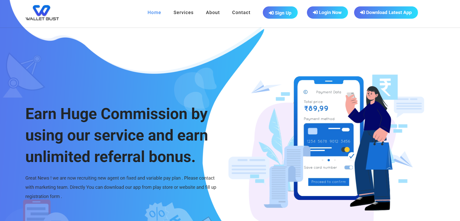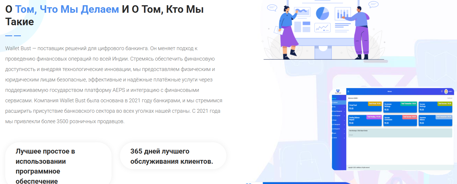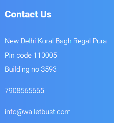 Wallet bust является вымышленной компанией, которая пытается убедить клиентов в четырехлетнем опыте работы, но ни одного упоминания о ресурсе для проведения платежей из Индии нет. На одностраничнике шарашки не представлено важных данных, например, тарифов и деталей реферальной системы. Полностью отсутствует официальная информация, а единственный контакт техподдержки невалидный.