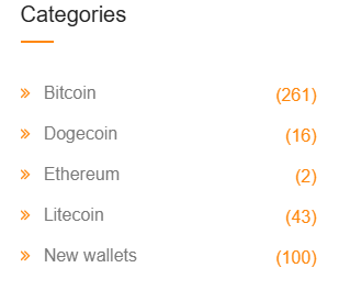 В рамках проекта пользователи могут покупать и продавать доступ к файлам криптовалютных кошельков. На сайте есть разные категории, что позволяет сортировать предложения и выбирать целевые криптовалюты – например, Bitcoin, Dogecoin или др.