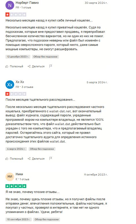 Мы нашли комментарии на одной из площадок, отзывы оказались смешанными, так как некоторые пользователи не доверяют проекту. Утверждается, что создатели сайта продают файлы кошельков, не проверяя их происхождение, из-за чего взломать их намного сложнее.