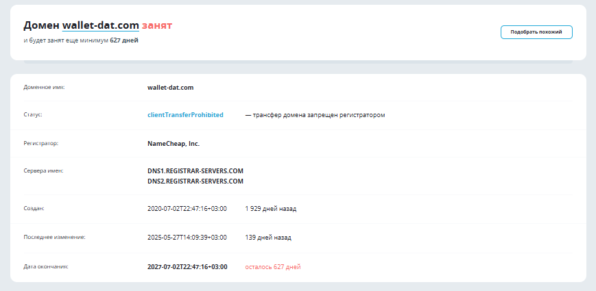 Мы проверили информацию о портале через архив, но не обнаружили нестыковок или признаков обмана. Домен принадлежал сервису Wallet Dat с момента регистрации и не был связан ни с какими другими организациями.