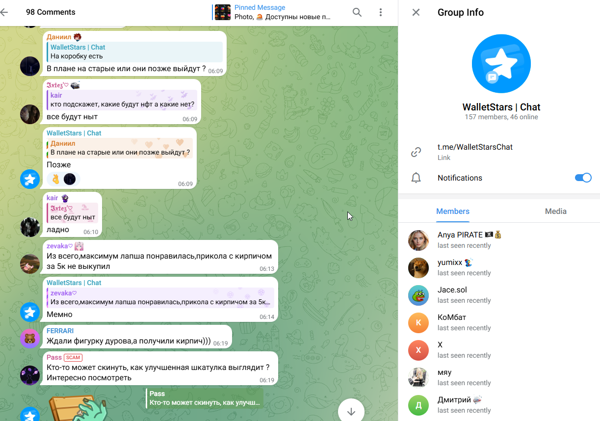 У проекта есть официальный телеграм-канал walletstarsofficial. Здесь можно найти много полезной информации. Во-первых, администрация проекта регулярно рассказывает о различных нововведениях. Здесь же публикуются сведения о том, когда кошелек закупает звезды для продажи. Во-вторых, время от времени в канале проводятся акции, в которых пользователи могут, либо выгоднее купить NFT, либо получить какие-то ценные призы.