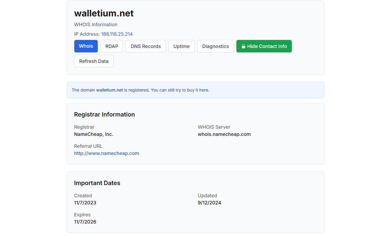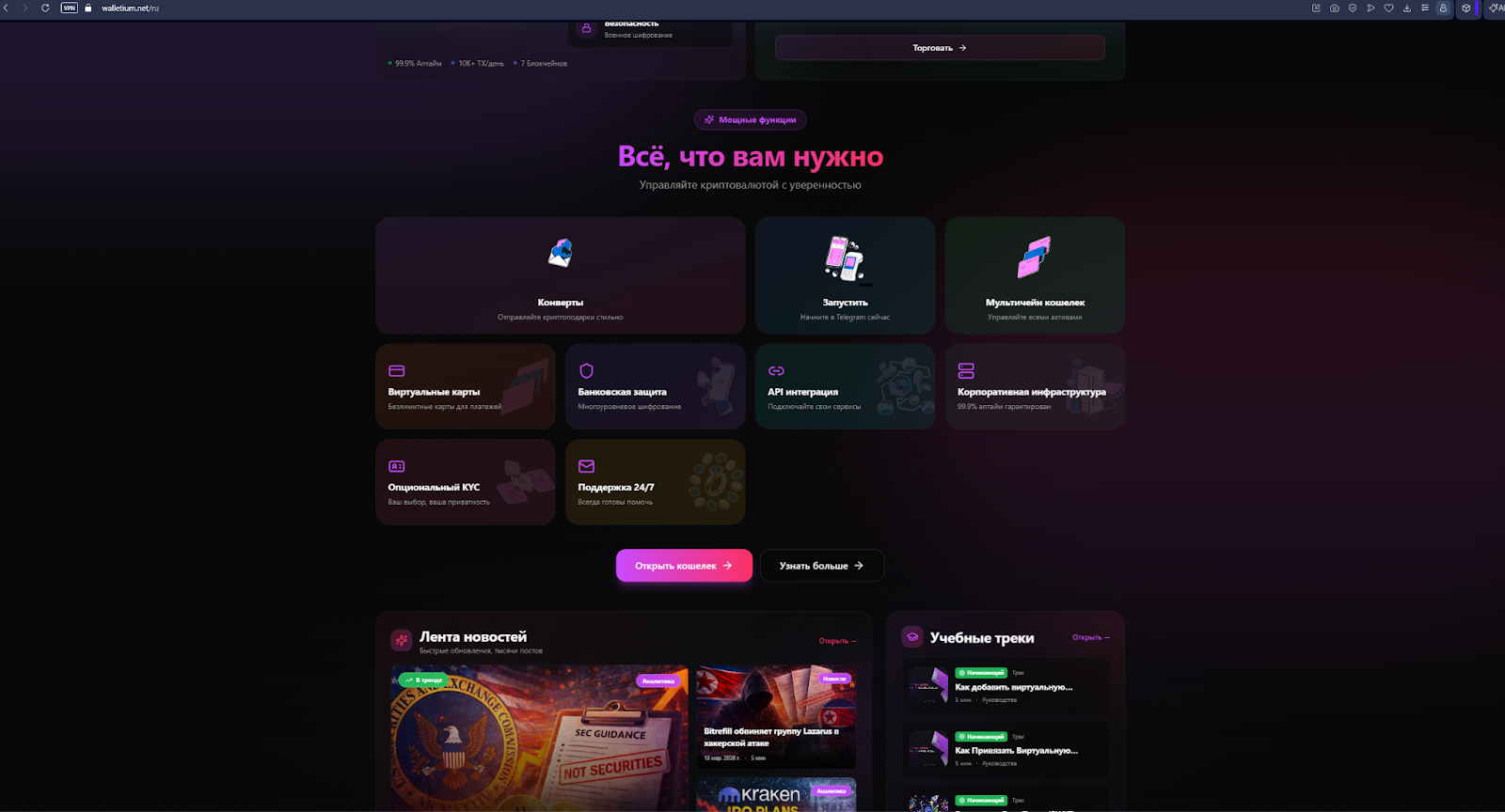 По информации Whois, домен «Валлетиум» был зарегистрирован в 2023 году через регистратор NameCheap, а информация о владельцах скрыта настройками приватности. На сайте обещают мгновенные переводы, обмен криптовалюты, вывод рублей через СБП и выпуск виртуальной Visa или Mastercard без обязательного KYC.