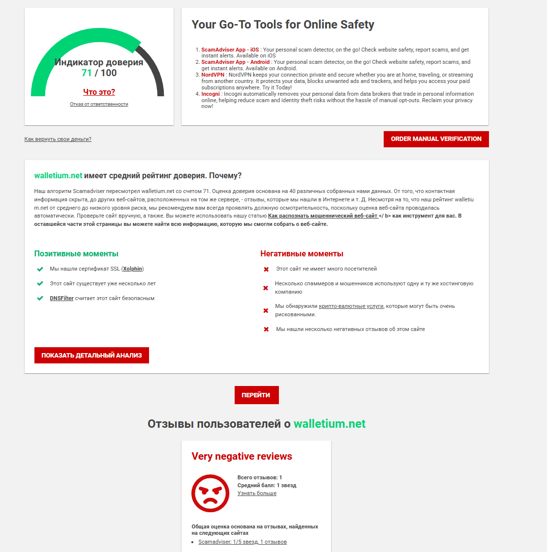 Стоит заметить, что на агрегаторах по проверке безопасности доменов, сайт площадки получил неплохой технический рейтинг. Из недостатков описана низкая посещаемость и использование такой же хостинговой компании спамерами и мошенниками. При этом на агрегаторе есть один негативный комментарий, который только указывает на низкий балл Walletium Wallet без каких-либо уточнений.