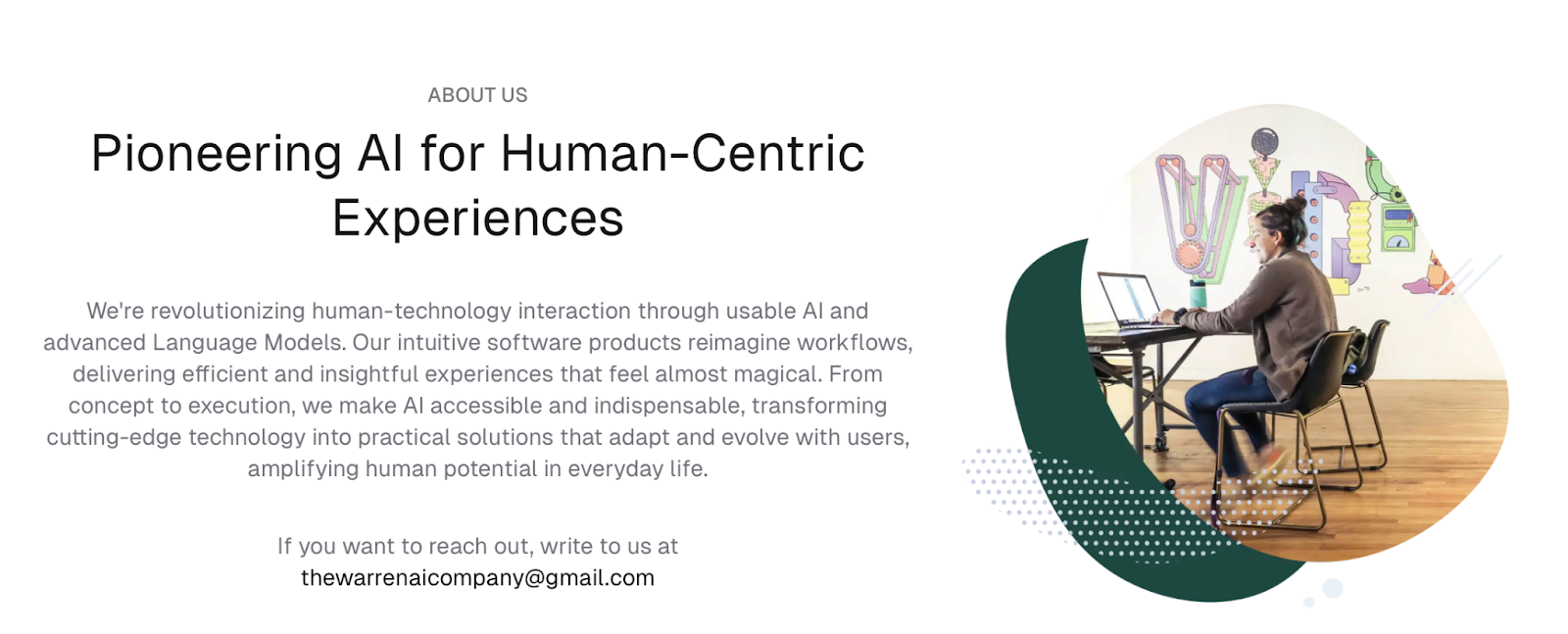 Проект существует только на одном ресурсе — официальном сайте thewarrenai com. Выполнен он в строгом минималистичном дизайне и темных тонах. На его страницах мы видим разделы с блоками по образовательным услугам и инвестициям.
