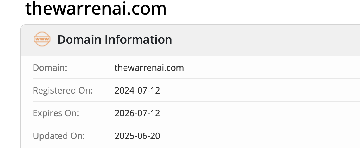 Отметим также достаточно молодой возраст домена thewarrenai com. Проект существует сравнительно недавно, что не позволяет оценить его долгосрочную репутацию.