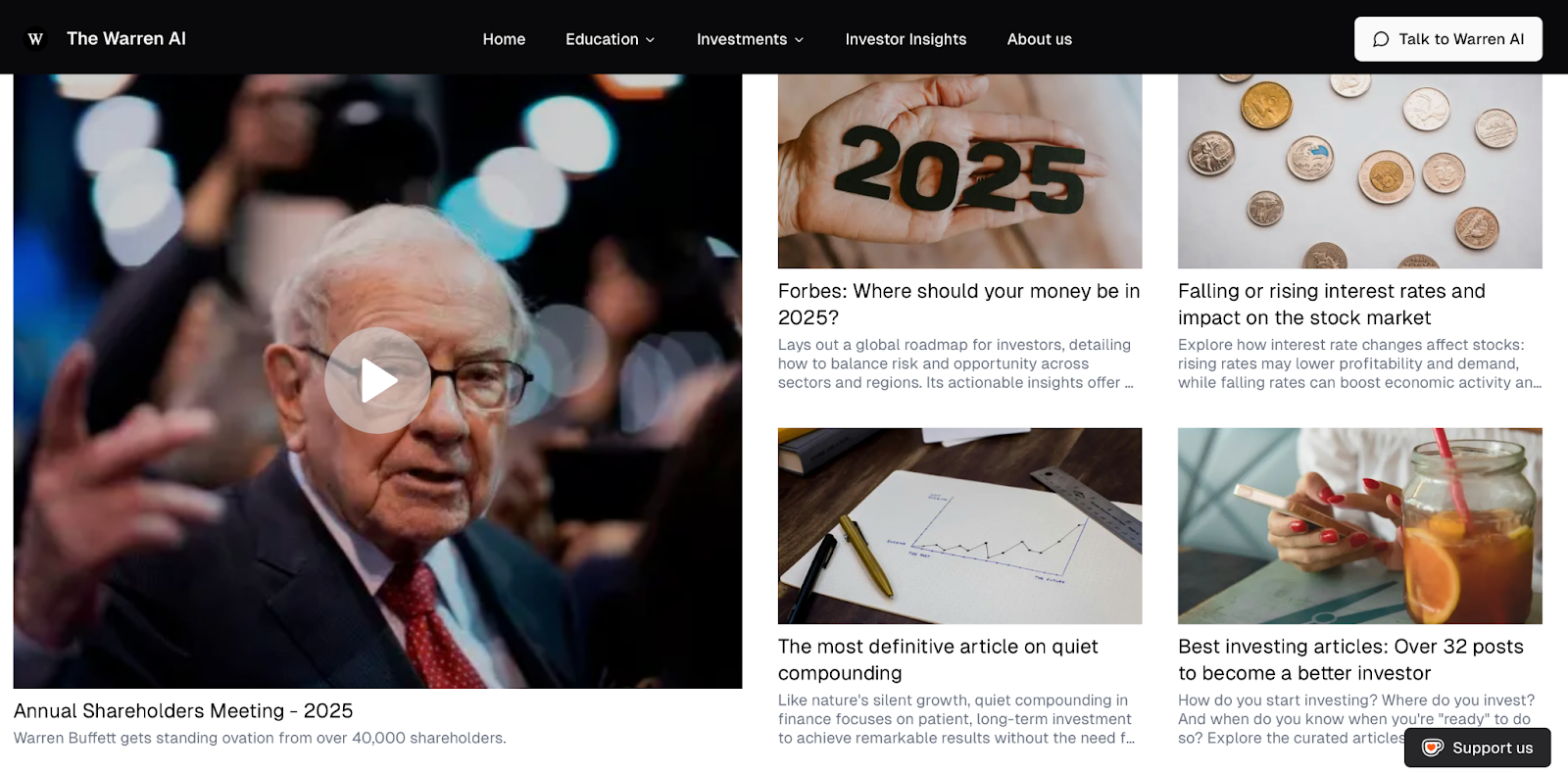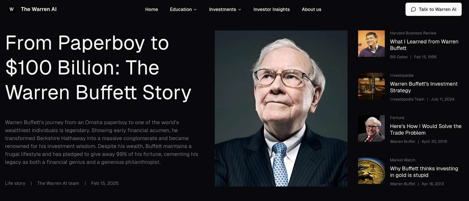 WarrenAI — любопытный сайт, использующий нейросети для имитации бесед со знаменитым Уорреном Баффеттом. На сайте предоставляются различные материалы о его подходах к капиталовложению, включая архивы деловых писем и углубленный разбор инвестиционного портфеля. Платформа приглашает нас пообщаться с виртуальным Баффеттом, а также изучить образовательные статьи и обзоры по неудачным сделкам.