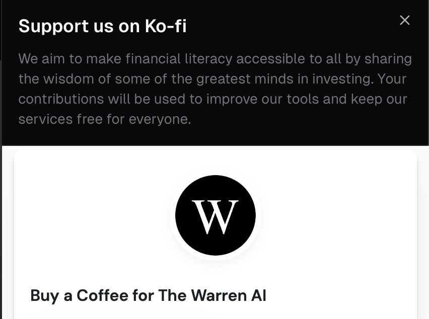 Warren AI — интересная попытка «оживить» инвестиционные идеи Баффетта через технологии, однако к проекту возникло много резонных вопросов. Настораживает странная просьба о донатах «на развитие» — чего именно, непонятно. На данный момент практической пользы от сайта и его наполнения практически нет.